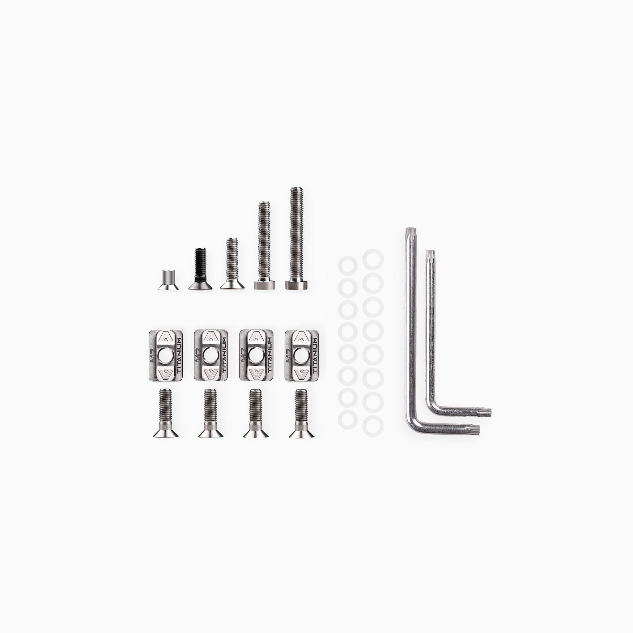 Hardware set to connect Alloy mast top plate to Alloy mast. Made from titanium and 316L stainless steel. Complete with tools, nylon washers.